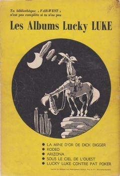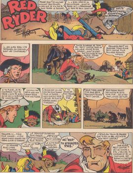 remarques: | album comportant plusieurs courts épisodes: - alors que Red Ryder soigne un peau-rouge blessé, petit castor, parti chercher un docteur, se fait attaquer par deux brigands qui veulent s'emparer du cheval Thunder >> p. 5 mais Thunder ne se laisse pas faire et avec l'aide de Thunder, petit castor réussira même à se débarrasser des deux bandits, comme récompense il reçoit 5000.- dollars avec lesquels il veut faire construire une nouvelle école à Rimrock, pour compléter la somme, une vente aux enchères est organisée, mais deux malfaiteurs volent la recette, ils seront vite retrouvés - Red Ryder et petit castor partent exploiter leur mine d'or, mais déjà les outlaws de Stumpy Holden veulent s'en emparer - la mine sera sauvegardée mais deux cowboys affamés: Oliver et Boliver s'introduisent dans la cuisine de la duchesse qui les chasse séance tenante, les deux frères jumeaux affamés apprendront un peu plus tard qu'ils viennent d'hériter un million de dollars, mais pour recevoir l'argent, ils doivent être mariés >> p. 44 les deux prétendantes aux deux frères >> si le graphisme reste encore acceptable, c'est vraiment le plus pauvre album de la série Dupuis en ce qui concerne texte et scénario >> à noter: la couverture d'album qui est signée A. Weinberg |