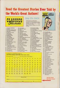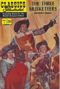 remarques: | Classics Illustrated est une série de bandes dessinées adaptées de la littérature classique, conçue par Albert Lewis Kanter en 1941 pour Elliot Publishing et publiée sous forme de comic books, la série a changé d'éditeur au fil du temps dont Classics Illustrated featuring stories by the world's greatest authors, commence en octobre 1941 avec une adaptation en 64 pages des trois mousquetaires par Gilberton Publications, en 1948 les coûts du papier augmentant, le nombre de pages est réduit à 48 pages et le restera pour les prochaines éditions Classics Illustrated a eu de nombreuses éditions étrangères: 162 titres au Royaume-Uni et un nombre équivalant pour la série françaises "les classiques illustrés" (principal concurrent Mondial Aventures qui ne produisit que 31 titres mais avec un graphisme meilleur), la série américaine devrait comporter 166 titres collectionnés ici sont quelques spécimens de l'édition américaine no 1 (1971) au prix de 25 cents, 48 pages 1615 d'Artagnan joins the three musketeers, all for one, one for all D'Artagnan has the mission by Madame Bonacieux to get the Queen's diamond studs from the duke of Buckingham; struggles with the guards of the Cardinal but finally the Cardinal Richelieu nominates d'Artagnan as a lieutenant in the musketeers >> a good story quite faithful to the novel of Alexandre Dumas with quite good illustrations |