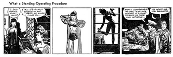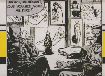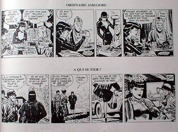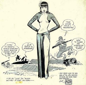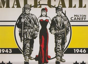 remarques: | dans la collection Copyright Futuropolis, 1943-1946 à raison de deux strips par page Male Call est un comic strip de Milton Caniff publié du 23 janvier 1943 au 3 mars 1946 dans la presse militaire américaine à destination des troupes engagées dans la Seconde Guerre mondiale, il était inspiré du comic strip britannique Jane de Norman Pett 1/ introduction, les exploits de Miss Lace du camp Newspaper Service - Milton Caniff, né dans l'Ohio et dessinateur bd depuis 1927, considéré comme l'un des meilleurs dessinateurs bd du monde (?) de par ses contrastes très expressionnistes du noir et du blanc ainsi qu'une conception quasiment cinématographique du découpage et du cadrage, particulièrement exprimé dans Terry and the pirates (avec la belle Burma) - Miss Lace = Mademoiselle Dentelle (male call = l'appel du mâle) est une créature du ministère US de la guerre pour relancer le courage des troupes, Miss Lace paraîtra dans les journeaux "Star and Stripes", "Yank" et autres journeaux réservés à la gent soldatesque, elle deviendra la pin-up officielle de l'US Army, inspirée de Rita Hayworth et restera pour le simple yankee la "femme" par excellence - après la guerre, Miss Lace disparaît et Caniff commençera sa nouvelle création "Steve Canyon" en 1947 2/ Miss Lace ou le repos du guerrier, comment on devient un artiste du strip par Milton Caniff - Caniff, un auteur-dessinateur à l'éloquence très riche dont quelques exemples (interview): - faire fi d'une bonne narration est la plus lamentable erreur que puisse commettre les débutants dessinateurs de bd, ceux-ci devraient suivre un cours approfondi de technique narrative en même temps qu'apprendre à tenir un crayon description par M. Caniff de la façon dont il a créé Terry and the pirates: - différence entre les daily et les Sunday strips - l'idée du scénario doit s'étendre sur au moins deux mois - se consacrer d'abord au texte puis à l'illustration - user le plus possible d'humour naturel dans les strips - avant d'introduire un nouveau personnage, s'imaginer ce personnage sous toutes les formes - consulter les archives pour la documentation - utiliser d'abord le crayon, puis dessiner les objets et personnages de premier plan de façon marquée, puis l'arrière-plan, puis à nouveau le 1er plan - beaucoup de gens savent dessiner, mais peu savent véritablement raconter une histoire 3/ résumé du récit de Miss Lace (male call) série de 160 strips (probablement daily strips), dans ces strips, Miss Lace appellent les soldats des "généraux"! série de strips à 3 ou 4 vignettes dont les meilleurs: un festin pimenté = Miss Burma, malheureux au jeu = Miss Lace + ce qu'on n'a pas vu aux actualités, un kilt bien moulant flancs exposés, restons corrects, erreur de tir, objectif en vue, la guerre des seces, quel zèle! et peace and love >> avant-dernier strip: pour mémoire = un strip avec mention des gradés dans l'armée de terre et marines ainsi que la navy et les garde-côtes >> un album de collection avec beaucoup de charme et d'humour naturel, malgré que plusieurs strips ne soient pas toujours faciles à comprendre |